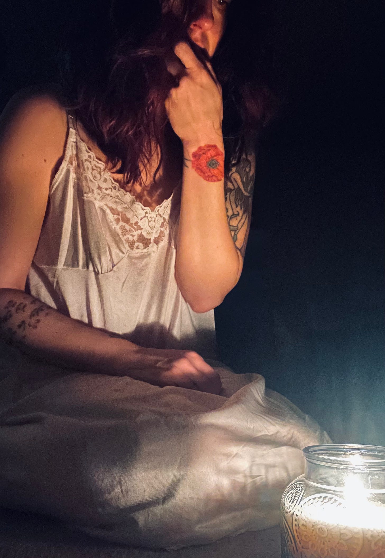 But I’m taking daily walks in the woods, usually in waking hours but sometimes at night. The trees are snowless these days, which is odd for February, and the stark bare branches feel appropriate. I’m playing records and drinking whiskey (not much, don’t worry) and lighting candles just to sit and watch them burn. I’m smearing ashes on my children for the start of Lent. I’m crying at the longing of love.